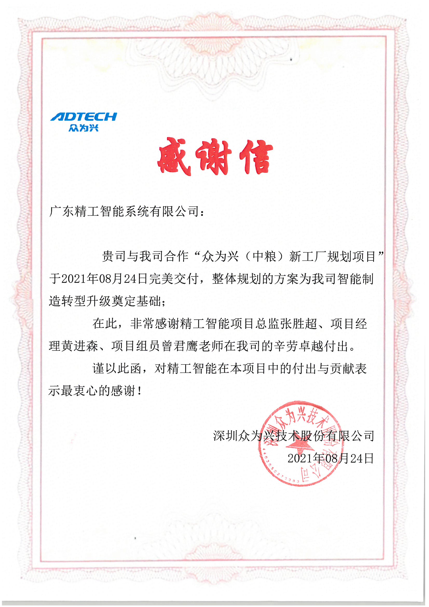 精工能够在2周时间内把项目完成到当前的效果,如此高效率、高质量的快速输出,得到了徐总以及众为兴的肯定,并因此收到众为兴的一封感谢信。徐总表示,待到项目功成的那一天,定邀请精工项目组参加投产仪式。