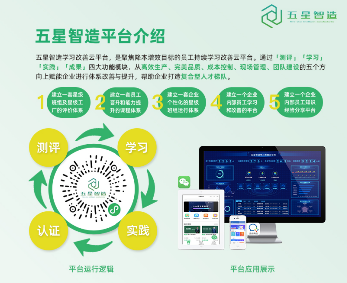 五星智造学习改善云平台,从高效生产、完美品质、成本控制、现场管理、团队建设五大维度出发,开发近千节贴合于制造管理系统的精品课程,将庞大的知识体系拆解为一个个小的知识点,让企业员工能够充分利用碎片化方式学习,数字化追踪效果呈现,打破工学矛盾,营造互学互检氛围,切实提高培训效率,为企业的可持续发展,提供源源不断的人力资本支持。