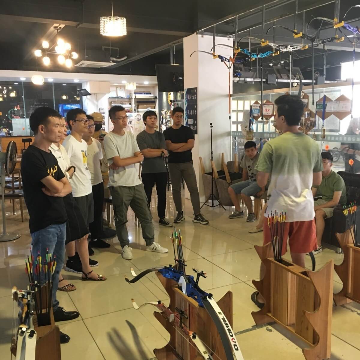 比赛马上开始!规则为:1.小伙伴们分成两组PK 2.每人6箭,箭中箭靶得分,规则了解清楚,就开始分组,分别为:国宝组,熊猫组,精工的小伙伴们真的是分组不分家,大家猜一下,那组是青铜那组是王者~
